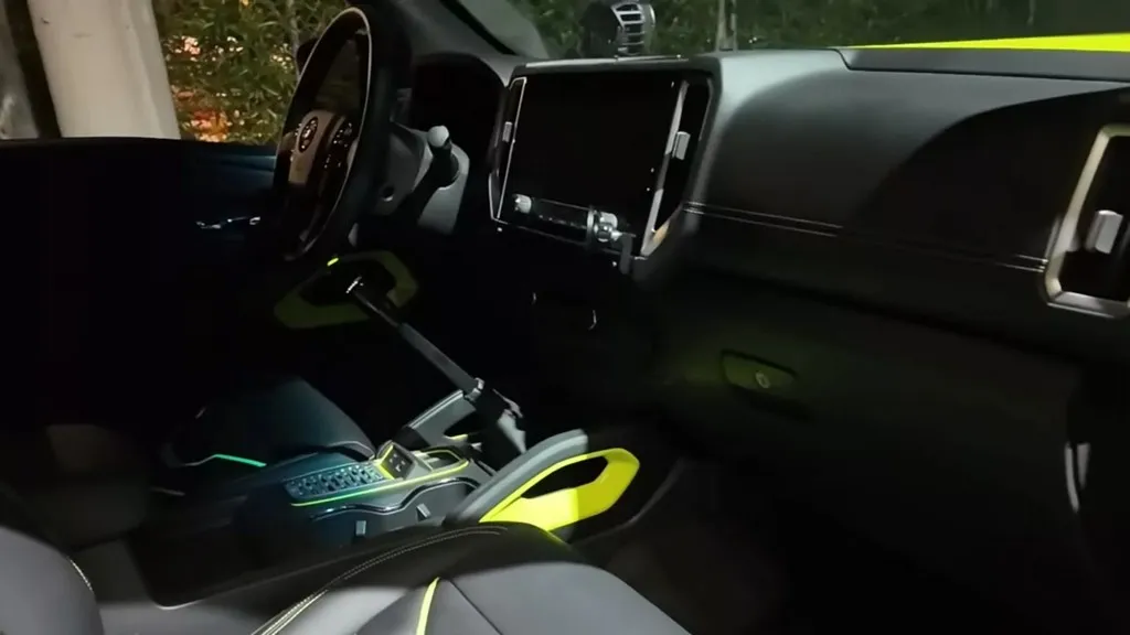 Step inside, and you’re essentially in a 2022 Frontier cabin. The dashboard, infotainment system, steering wheel, seats, and door panels all come from the modern pickup. The interior is trimmed in black leather with bold Citrus Strike yellow-green accents on the inserts and seatbelts. WeatherTech mats and a reinforced cargo bed coating add utility, bringing comfort and tech far beyond what the original Xterra offered. But the real magic is the third pedal — yes, this SUV comes with a six-speed manual transmission, giving drivers a pure, mechanical connection to the road.