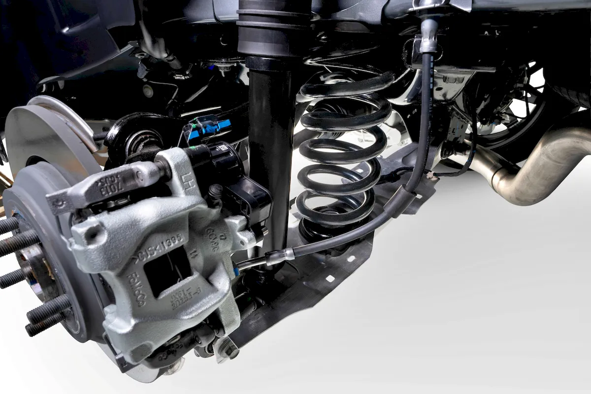 It doesn’t stop there. The 300T rides on intricate 20-inch wheels borrowed from the Mustang Mach-E GT, wrapped in Pirelli P Zero Elect tires — though the show truck wears Michelin Pilot Sport 4S rubber “because they just look better,” as Ford cheekily put it. The suspension sits lower — 10 mm up front and 30 mm in the rear — and features single-tube dampers and a thicker rear stabilizer bar sourced from the Maverick Lobo.