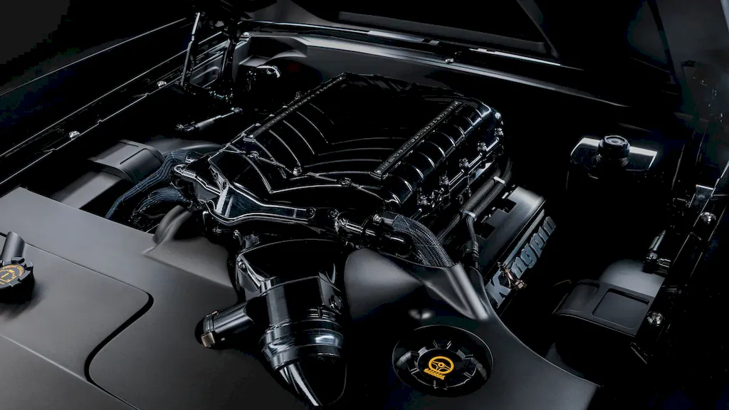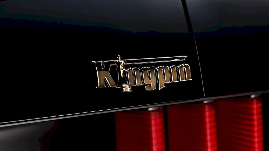 Meet KINGPIN. It’s a 1969 Mustang Mach 1 that took more than 5,500 hours of meticulous craftsmanship to complete. Under the hood lies a 5.0-liter Wegner Motorsports Coyote V8 topped with a Whipple supercharger, pushing out over 800 horsepower. All that fury is sent to the rear wheels through a six-speed Bowler Transmissions Carbon Edition manual gearbox.