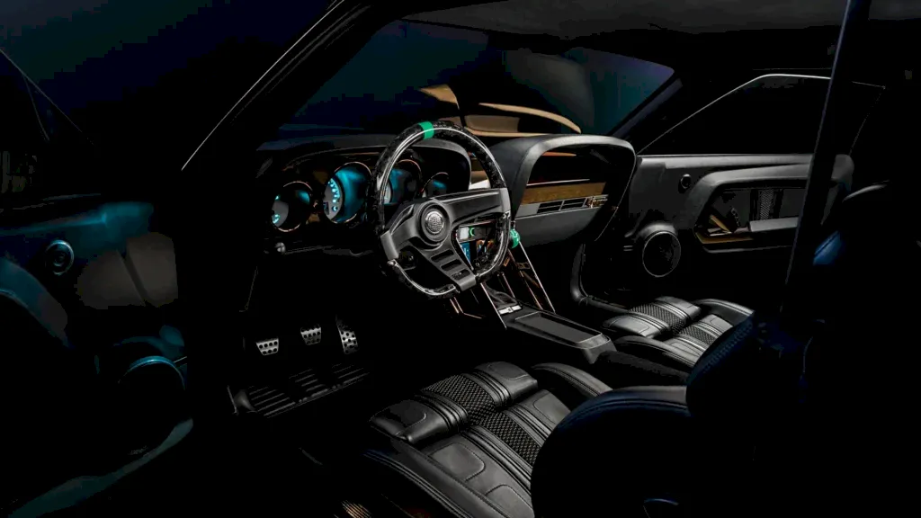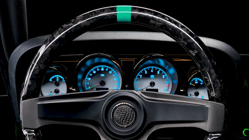 Inside, the cabin mixes performance and attitude: there’s a pressed-carbon steering wheel, a Dakota digital gauge cluster, a modern climate control system, and a custom-built roll cage. The bespoke interior is finished in a color Ringbrothers calls “Grab-Her Green” — “a playful nod to Ford’s classic Grabber Green, but with a slightly darker twist to suit the car’s villainous personality.”
