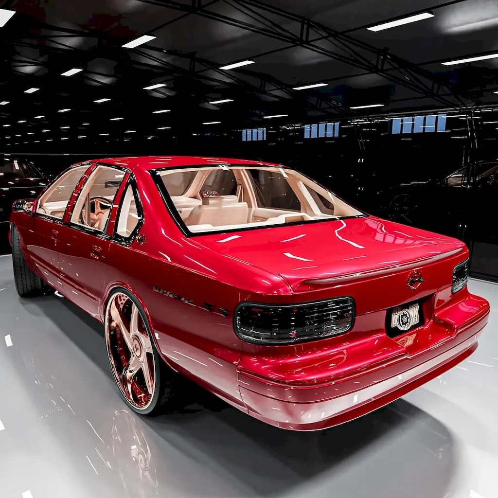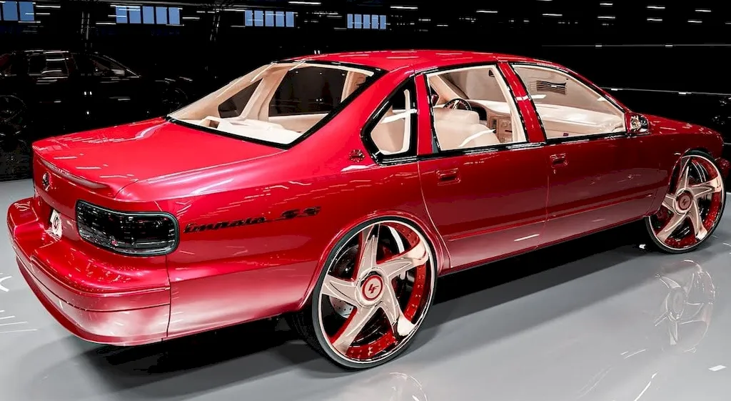 As the headline suggests, this 1996 Chevrolet Impala SS is purely a digital creation. The rendering comes from Instagram user @412donklife, who posted the artwork just a few days ago. Using digital tools, the artist transformed the classic sedan into a head-turning showpiece. The Lexani wheels — finished in a striking rose gold and red two-tone — are wrapped in ultra-thin tires and measure a massive 26 inches across. They fill the wheel arches perfectly, giving the car an exaggerated yet cohesive look.