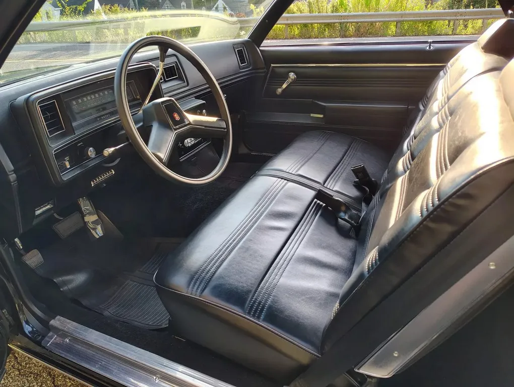 The exterior looks flawless. The body wears a glossy black paint job complemented by an optional vinyl roof. Chrome bumpers, fender moldings, and original 14-inch wheels complete the look, giving it an unmistakable late-’70s charm.