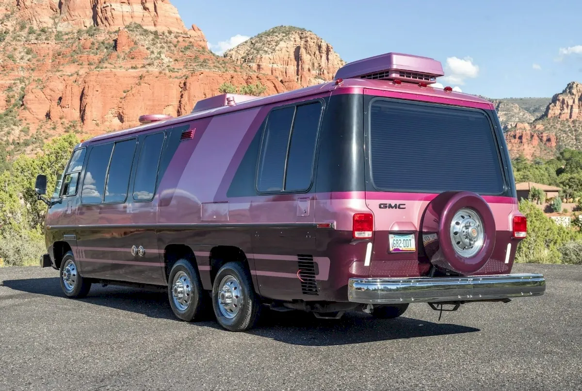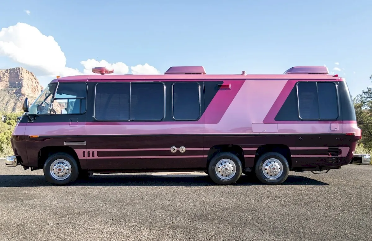This particular example stands out even more. It’s a 1977 GMC Motorhome configured in the Eleganza II layout, but with custom touches that give it an unmistakable presence. Any GMC Motorhome preserved this well is worth noting, yet the pink-and-purple exterior takes this one into its own category.