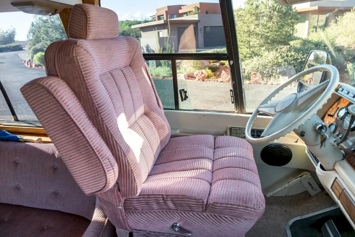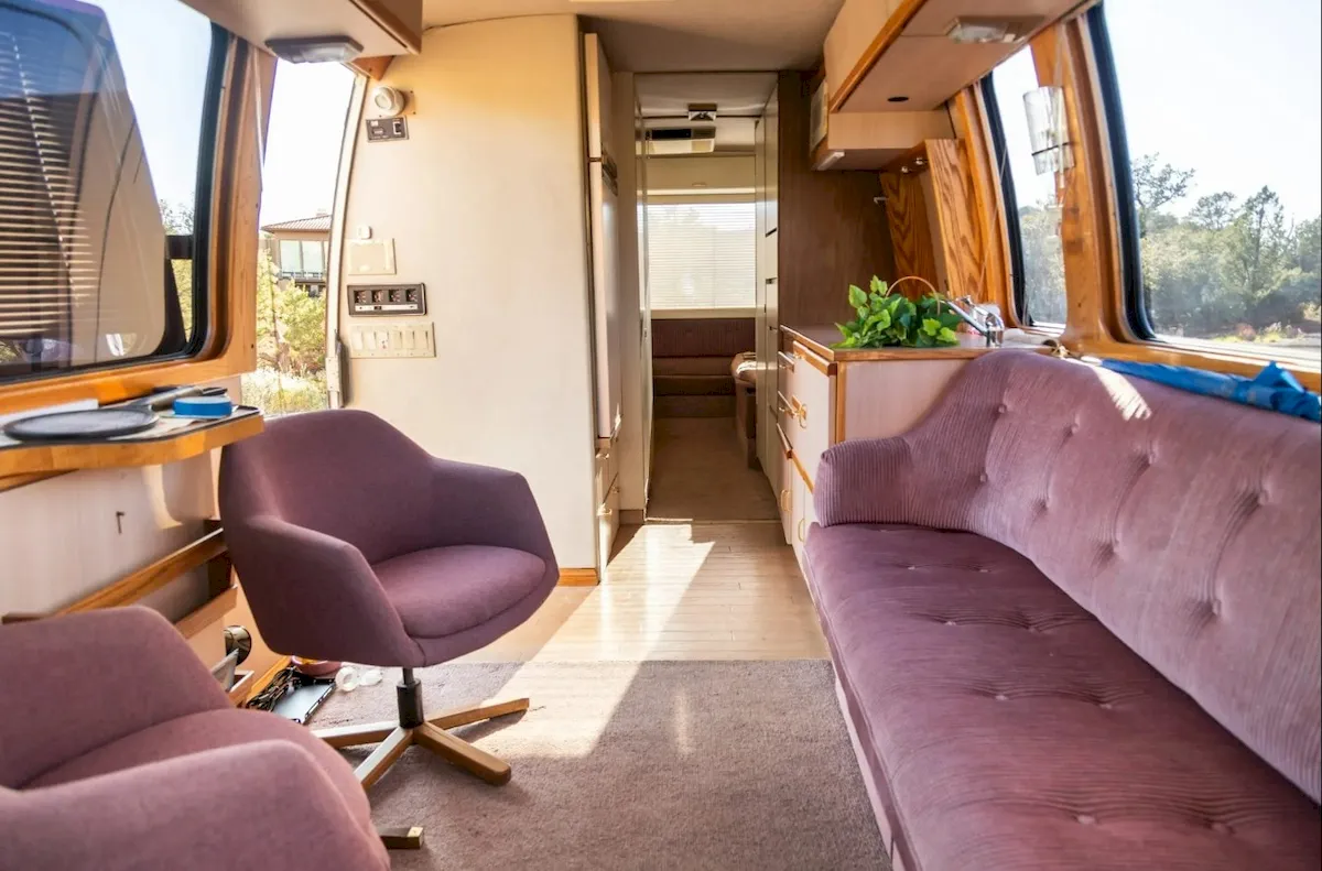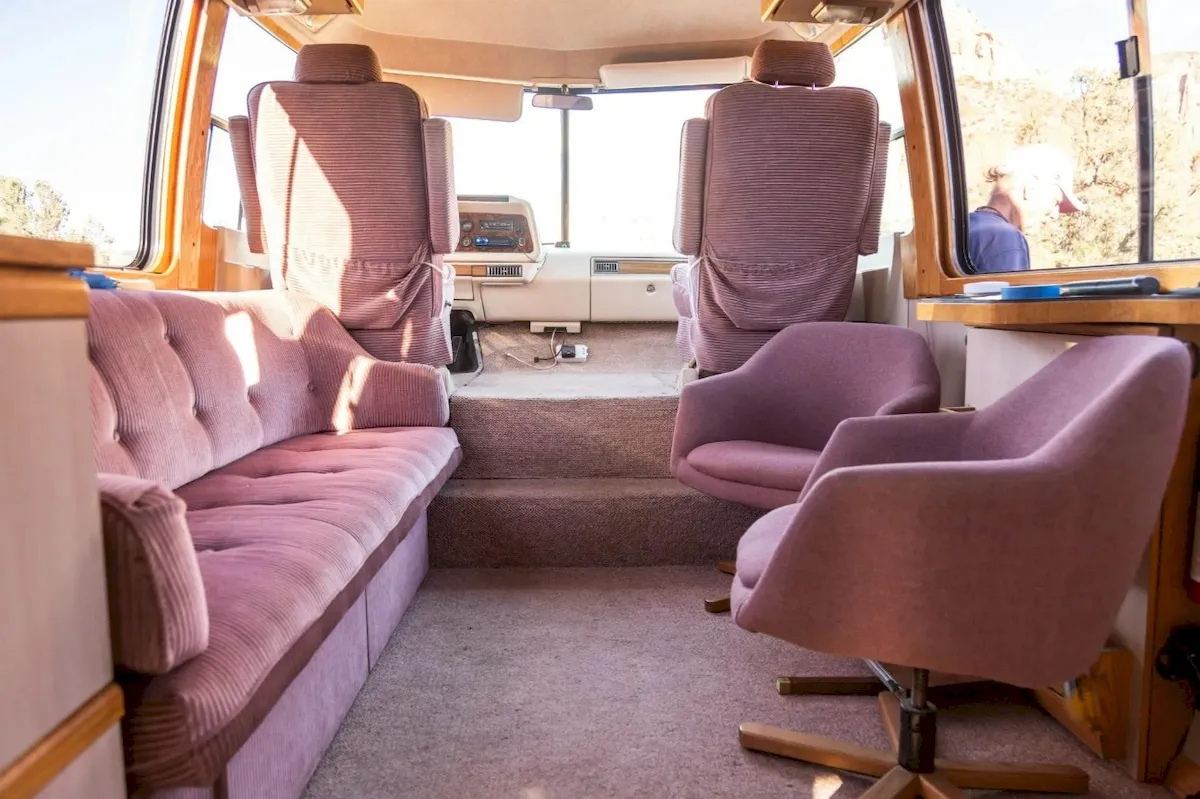 Inside, the cabin embraces the same disco energy, featuring pink corded upholstery, gray carpeting, and wood-grain accents. Behind the pink cab seats is a step-down lounge with two swiveling armchairs in a small dining setup, plus a sofa.