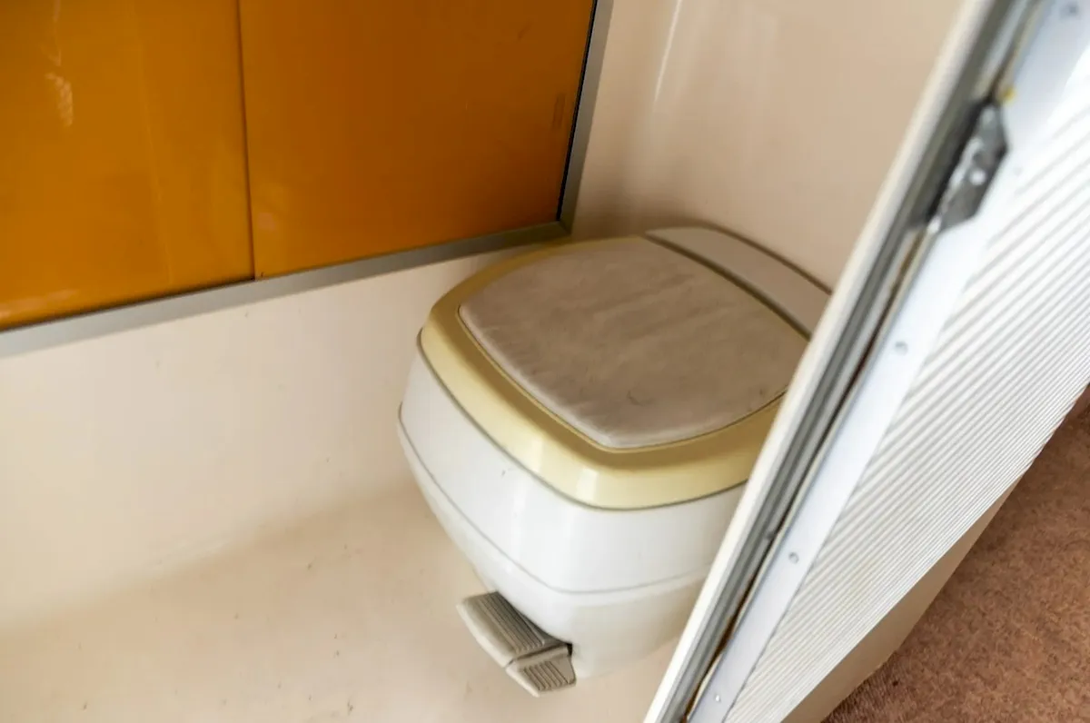 The galley kitchen comes equipped with a cooktop, microwave, compact fridge and freezer, sink, and ample storage. A wet bath includes a shower, sink, and foot-flush toilet. The rear bedroom offers two bunks that can be joined into a larger bed.