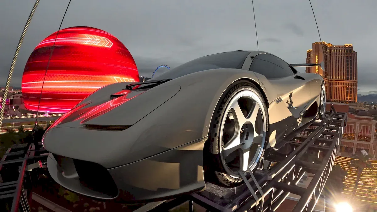 The show car made its entrance in quintessential Vegas fashion: it arrived at the Wynn hotel suspended from a helicopter, flying several hundred feet above the city’s landmarks before touching down for the sale.