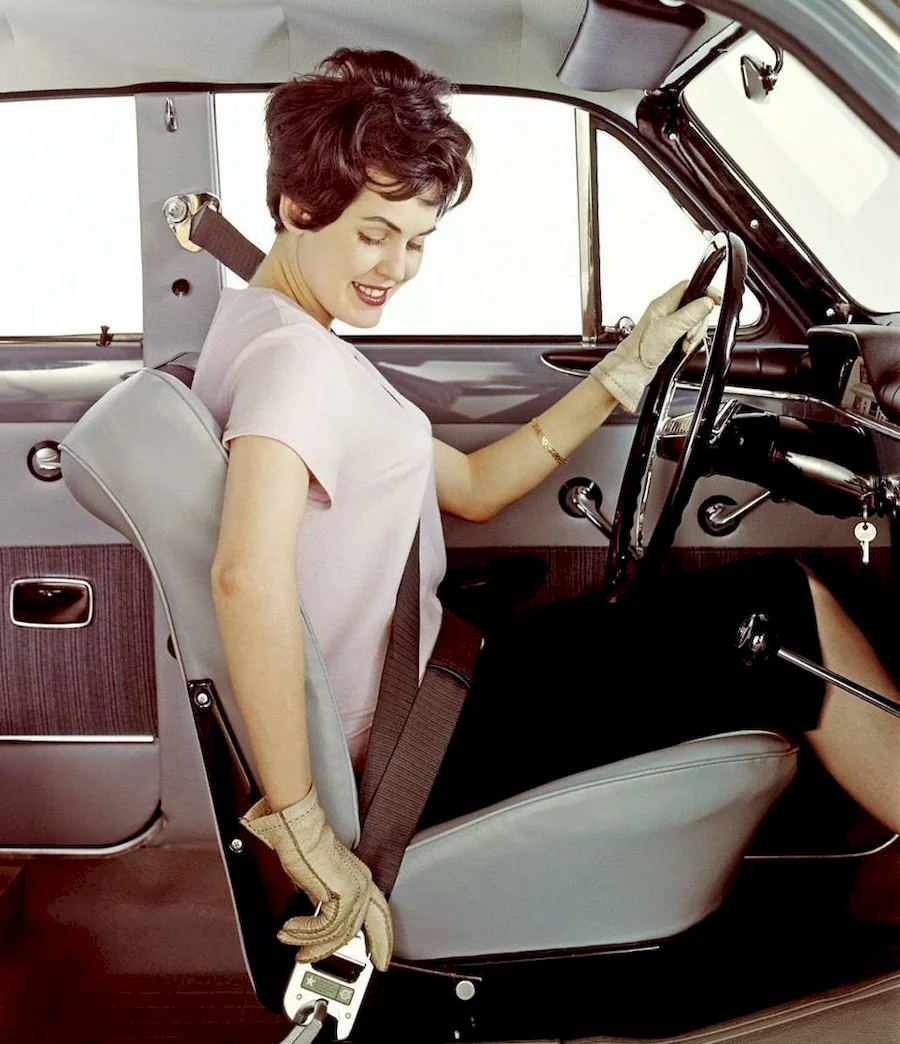 The three-point seat belt was patented in the U.S. in 1951, anchoring the torso and hips with the buckle placed at the center. Volvo refined the idea in 1963, creating a version that could be latched with one hand, with the buckle sitting to the side near the hip. This design also introduced the now-standard inertia reel that locks the belt when the occupant lunges forward.