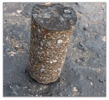 A core is a cylindrical sample of asphalt or concrete removed from the pavement for laboratory testing. These samples help engineers measure: