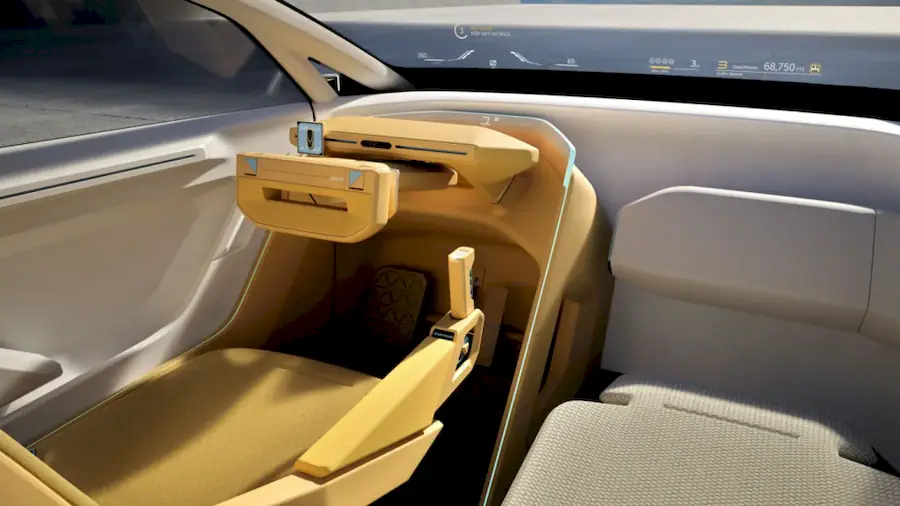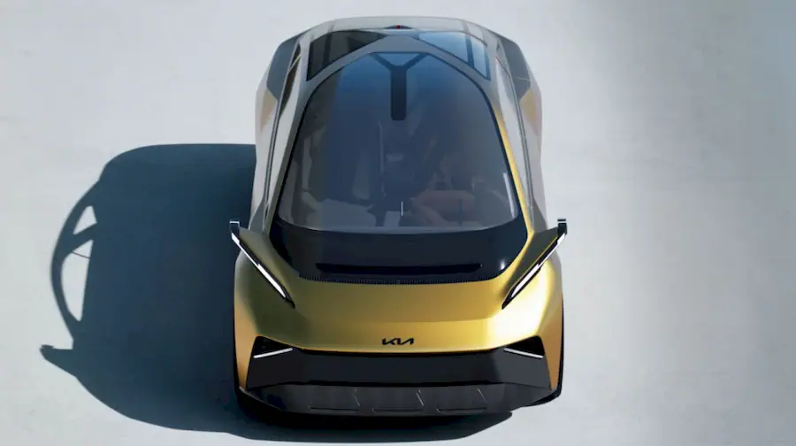 Inside, the driver-focused layout is obvious. The driver’s seat is paired with a unique joystick-style controller integrated into a yoke-shaped steering wheel. There’s also an augmented-reality head-up display that projects graphics that appear to “float above the road,” according to Kia.