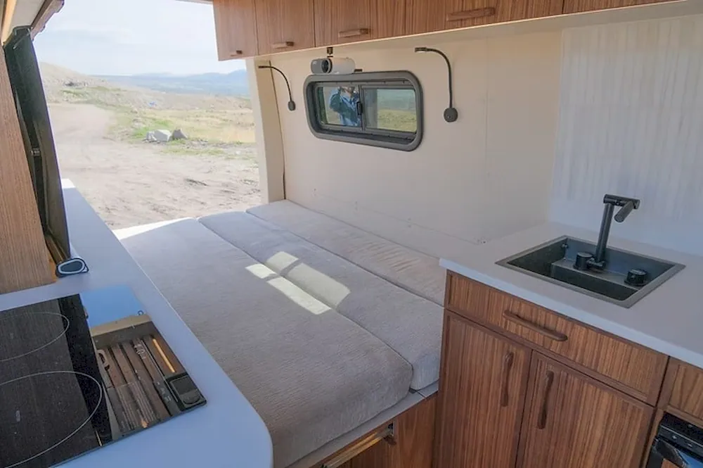 The living area can host four to five people thanks to swivel cab seats, a rear couch-style bench, and a removable Lagun table. The bench doubles as a lounge spot and entertainment hub—there’s even a portable projector and screen stored in the cabinetry for impromptu movie nights. At bedtime, the bench extends into a roomy 75-by-50-inch sleeping space suitable for two adults.