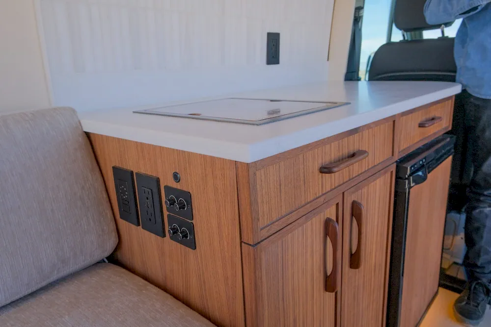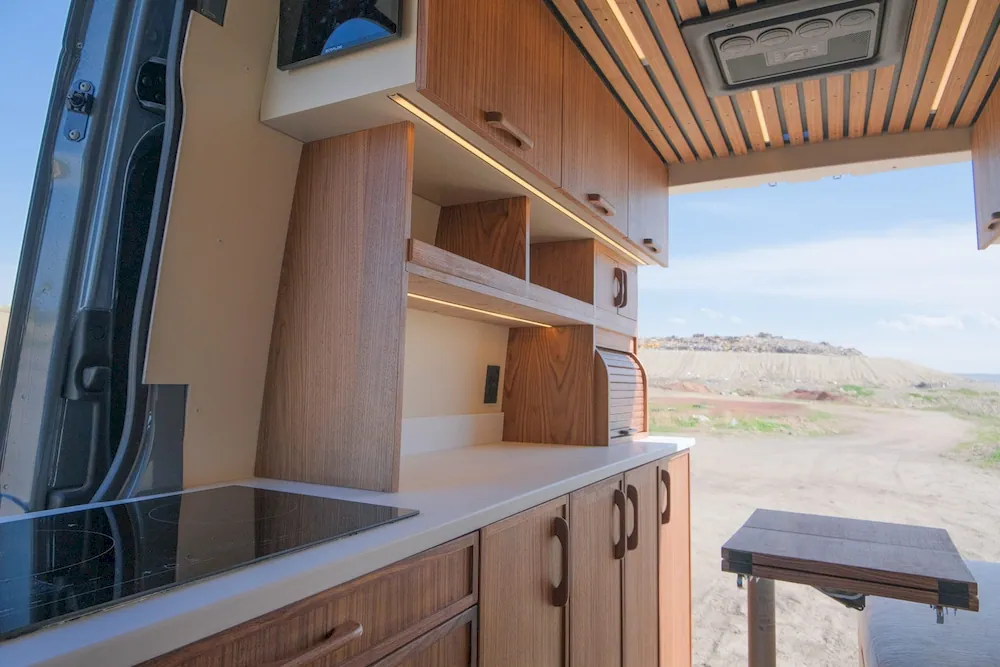 The kitchen setup features a hidden undermount sink with a collapsible faucet, a Bodega 12V fridge/freezer, and an Empava induction cooktop. Generous countertop space makes meal prep easy, while a solid walnut tambour compartment adds both utility and character.