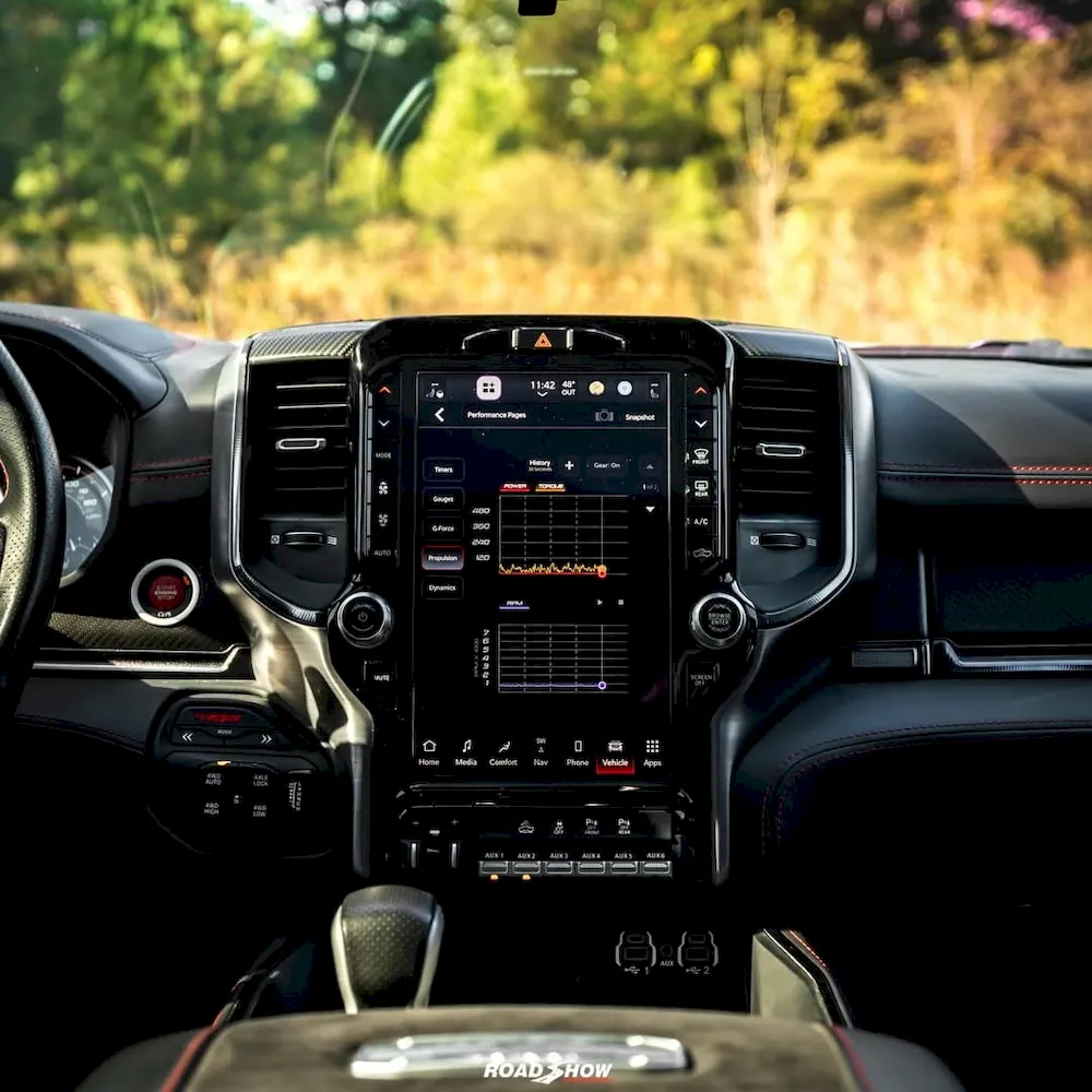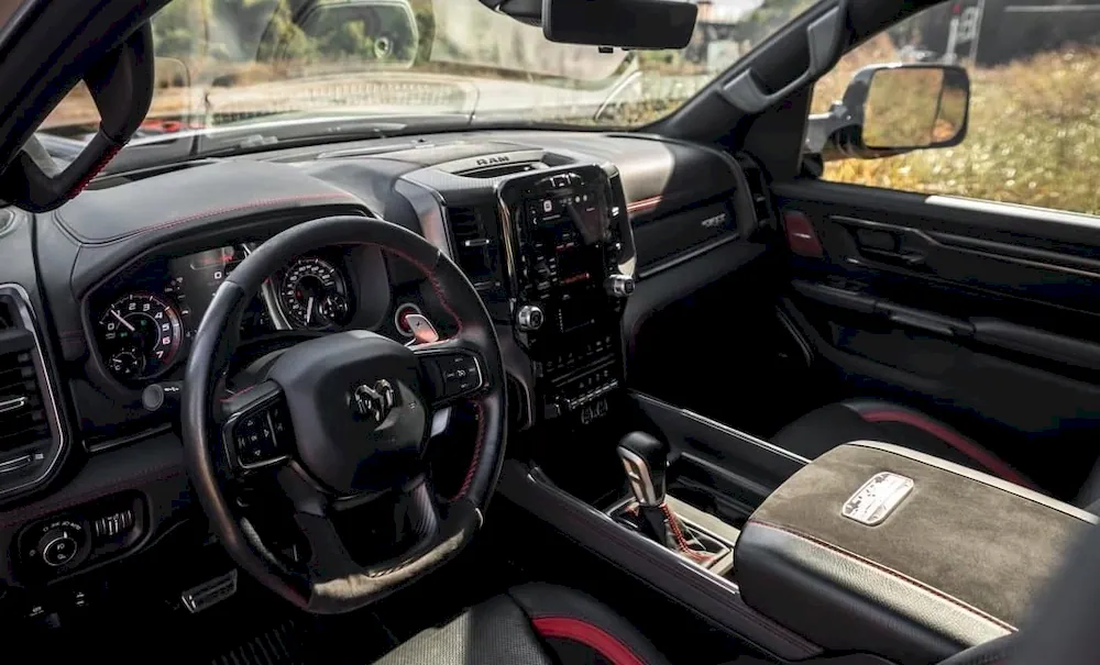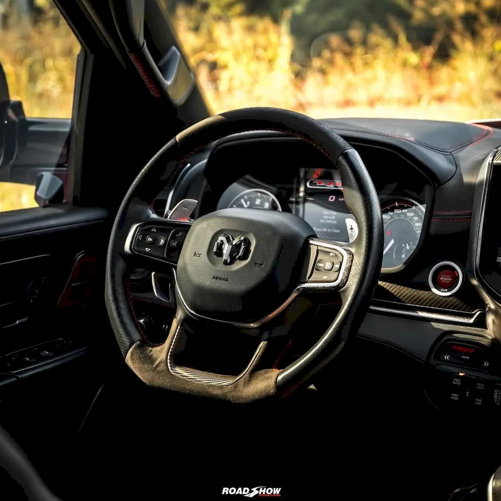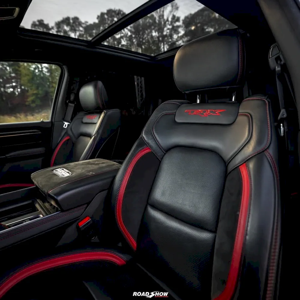 On the inside, this tuned Ram 1500 TRX has black leather upholstery with a few red inserts for contrast. It is also home to Alcantara, as well as red stitching. The seatbacks are decorated with the 'TRX' emblem, and there is a special plaque on the center console. The flat-bottom steering wheel was partially wrapped in Alcantara, and this machine also has a panoramic roof and a black headliner.