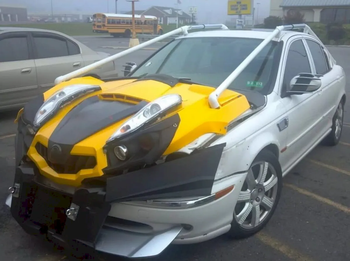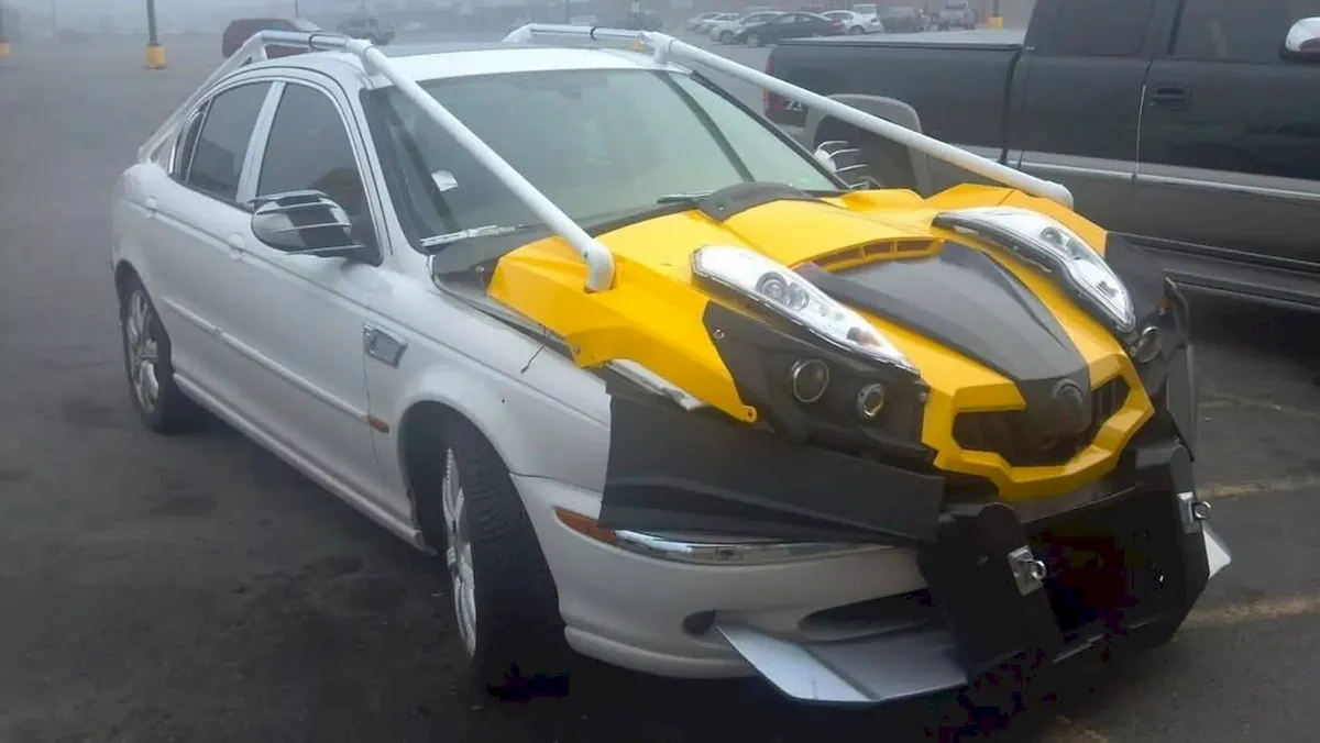 As a result, the Jaguar X-Type now features a new yellow hood with black plastic trim. On top, there are two extra headlights, vaguely resembling the upper lights of a Nissan Juke.