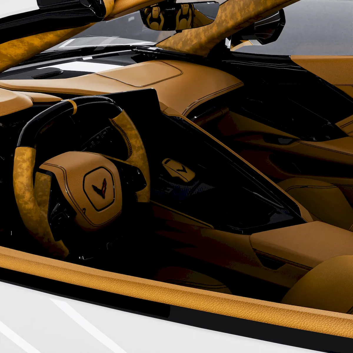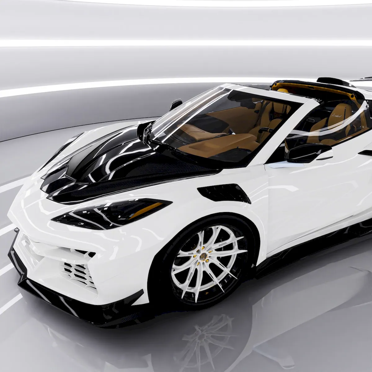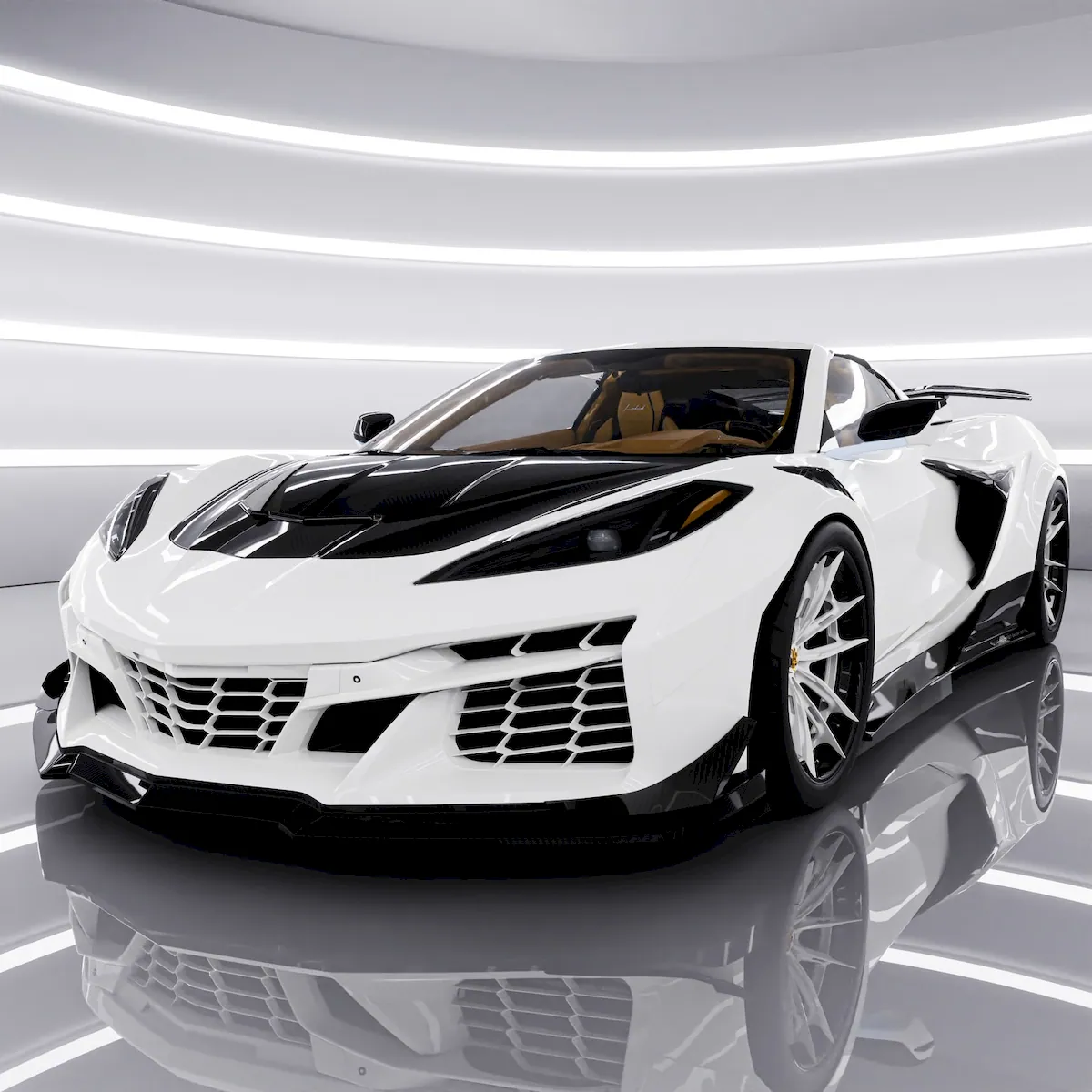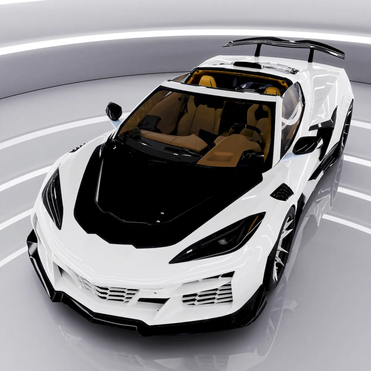 An eye-catching render of the Chevrolet Corvette Z06 C8 has surfaced online, featuring a striking two-tone exterior. The design draws inspiration from 1990s aesthetics and is enhanced with unique details. Inside, the car is trimmed in light-colored leather, while the exterior showcases black accents and an aggressive body kit.