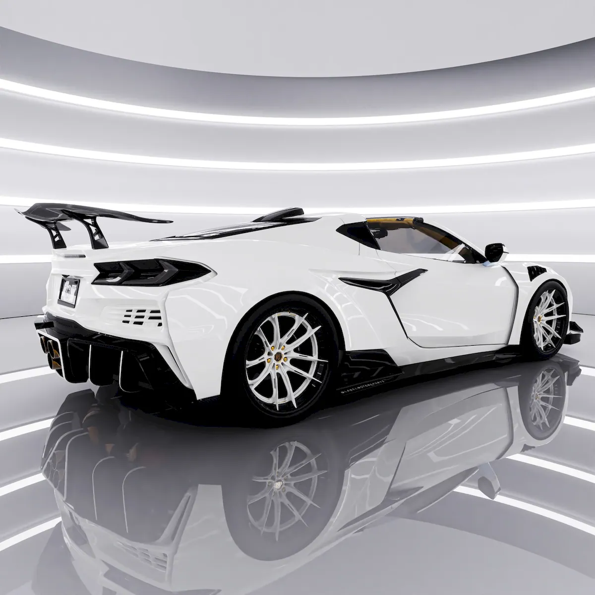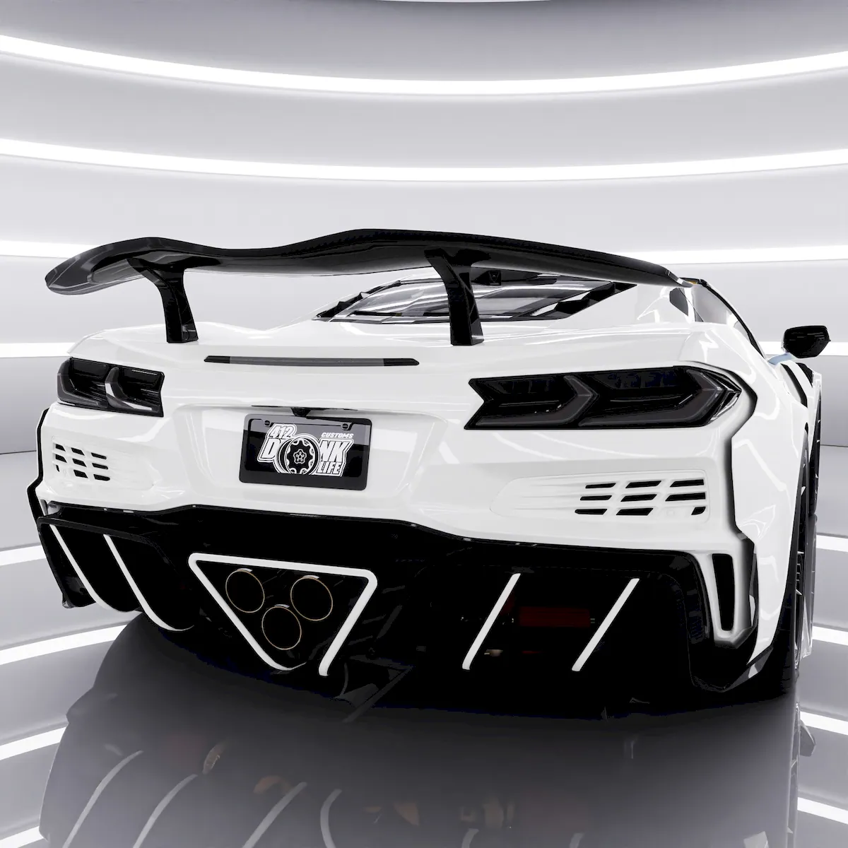 The rear of the Corvette Z06 C8 has also been heavily reworked. A new diffuser with white inserts and three large exhaust outlets stands out immediately. The rear bumper looks more expressive, while an air intake above the rear window—possibly more than just decorative—adds to the race-inspired feel. A large rear spoiler sits on the decklid, and tinted taillights along with custom aftermarket wheels complete the look.