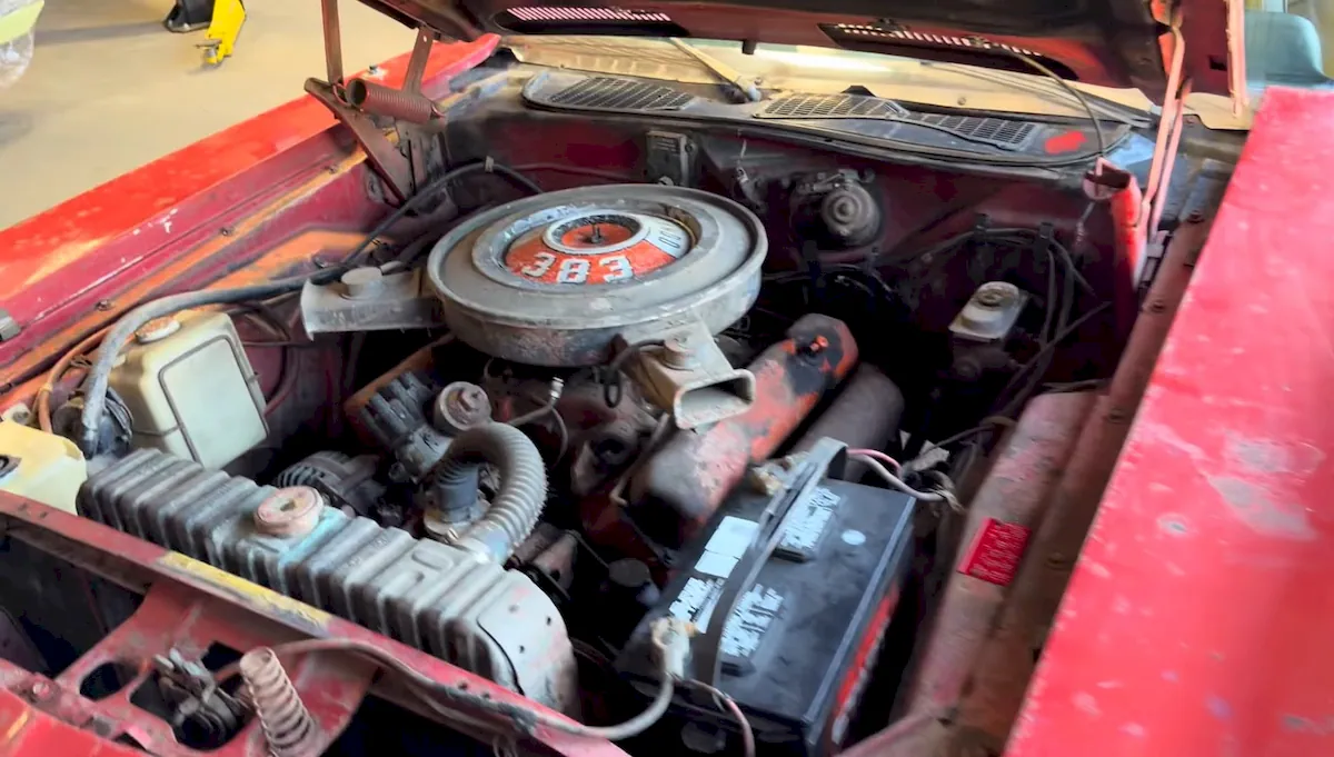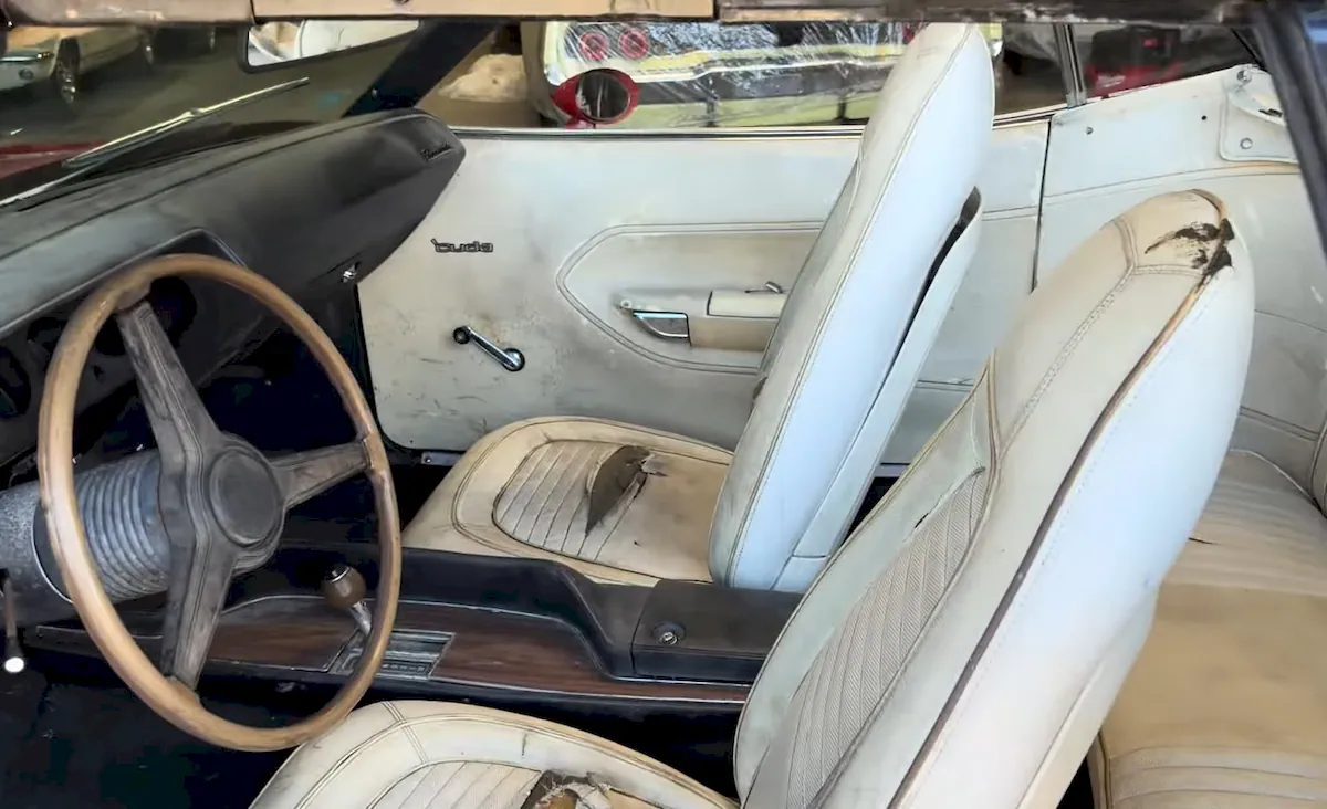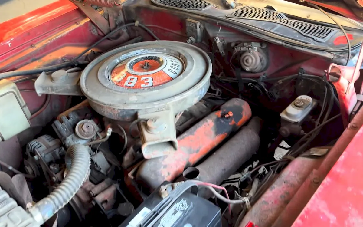 The original engine is still in place under the hood and doesn’t appear to have ever been pulled. The video doesn’t show the V8 running, so it’s safe to assume it doesn’t start at the moment. Hopefully, the engine isn’t seized after spending decades without fuel.
