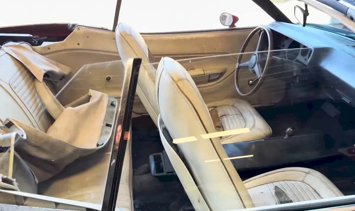 Despite its worn appearance, it’s far from a total wreck. The paint is tired, the convertible top is missing, but the body looks complete and largely free of serious rust. The once-bright white interior has clearly taken a beating: both front seats show heavy wear, and nearly every light-colored surface is stained and dirty.