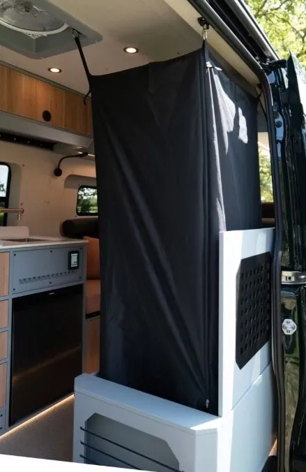 One standout feature is the cleverly concealed indoor shower. It includes a stainless shower tray, hot and cold water, and a built-in curtain, all hidden away when not in use. A removable composting toilet fits inside the shower compartment, and an exterior rear shower is also included.