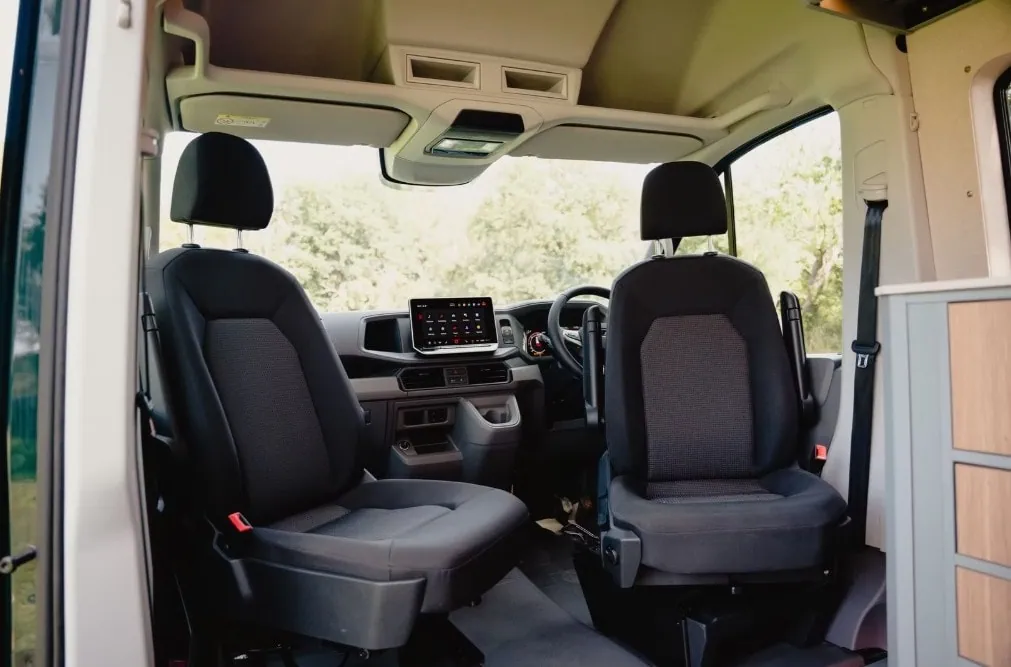 Inside, the Summit 2.0 is designed for two people and makes excellent use of available space. With no bulkhead behind the cab, the interior feels open and social. Swivel front seats and a compact dinette create a flexible seating area that works for meals, work, or downtime. An optional insert converts the space into an L-shaped lounge, a feature rarely seen in vans of this size.