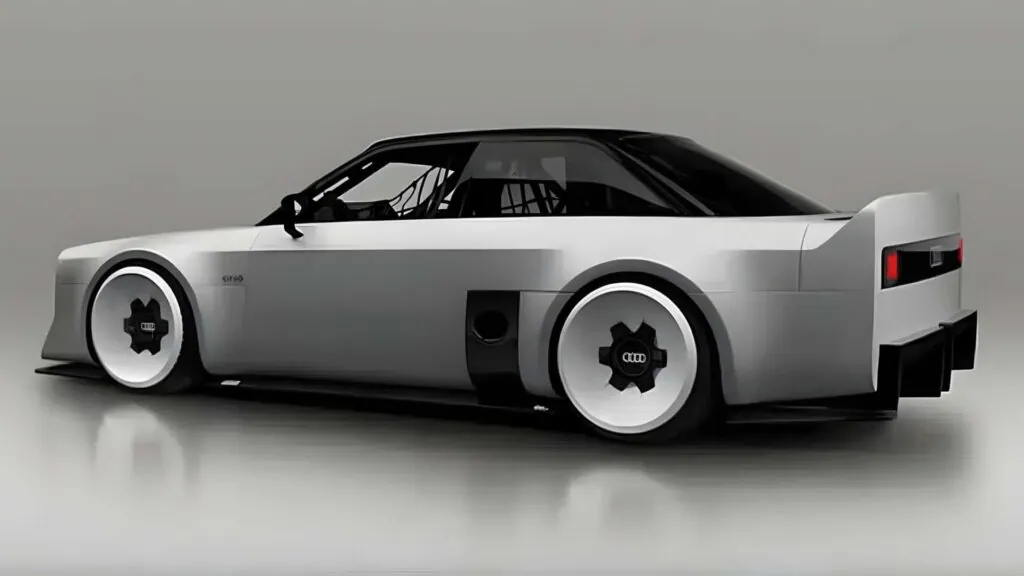 Visually, the Audi GT50 Concept embraces a bold retro racing aesthetic. Its design draws inspiration from Audi’s iconic race cars of the late 1980s and early 1990s that competed in American IMSA and Trans-Am series. The concept features an angular, three-box silhouette, flared wheel arches, aggressive aerodynamic elements, and oversized wheels that give it the stance of a true track machine.