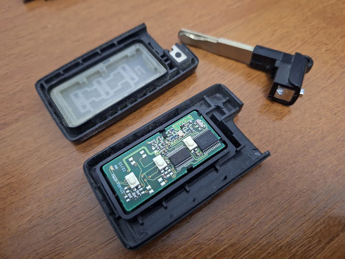 As mentioned, modern car keys contain electronic components. If you were to open one up, the inside would typically look like this: