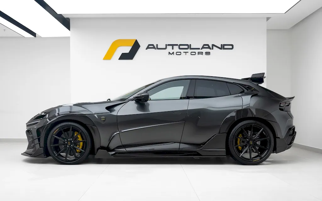 One of the most striking details is the wheel setup. The forged Keyvany alloys measure a massive 24 inches, yet they don’t look out of place thanks to the wide stance and flared fenders. The exterior kit is extensive, featuring aggressive side skirts, a sharp front splitter, a vented hood, a large rear wing, and an oversized diffuser with integrated brake light and revised exhaust outlets.