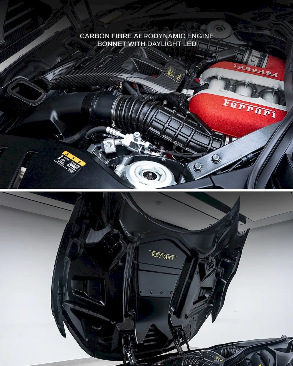 Ferrari badges have been removed in favor of Keyvany branding, including on the wheels and even the yellow-painted brake calipers. Tinted headlights and taillights complete the all-black, “murdered-out” aesthetic.