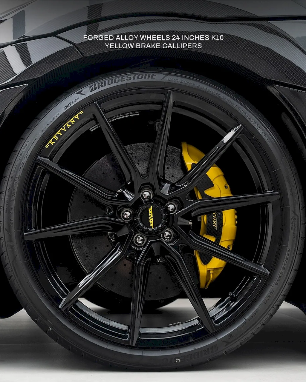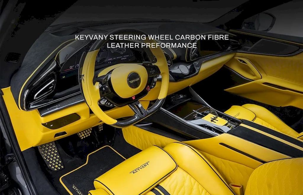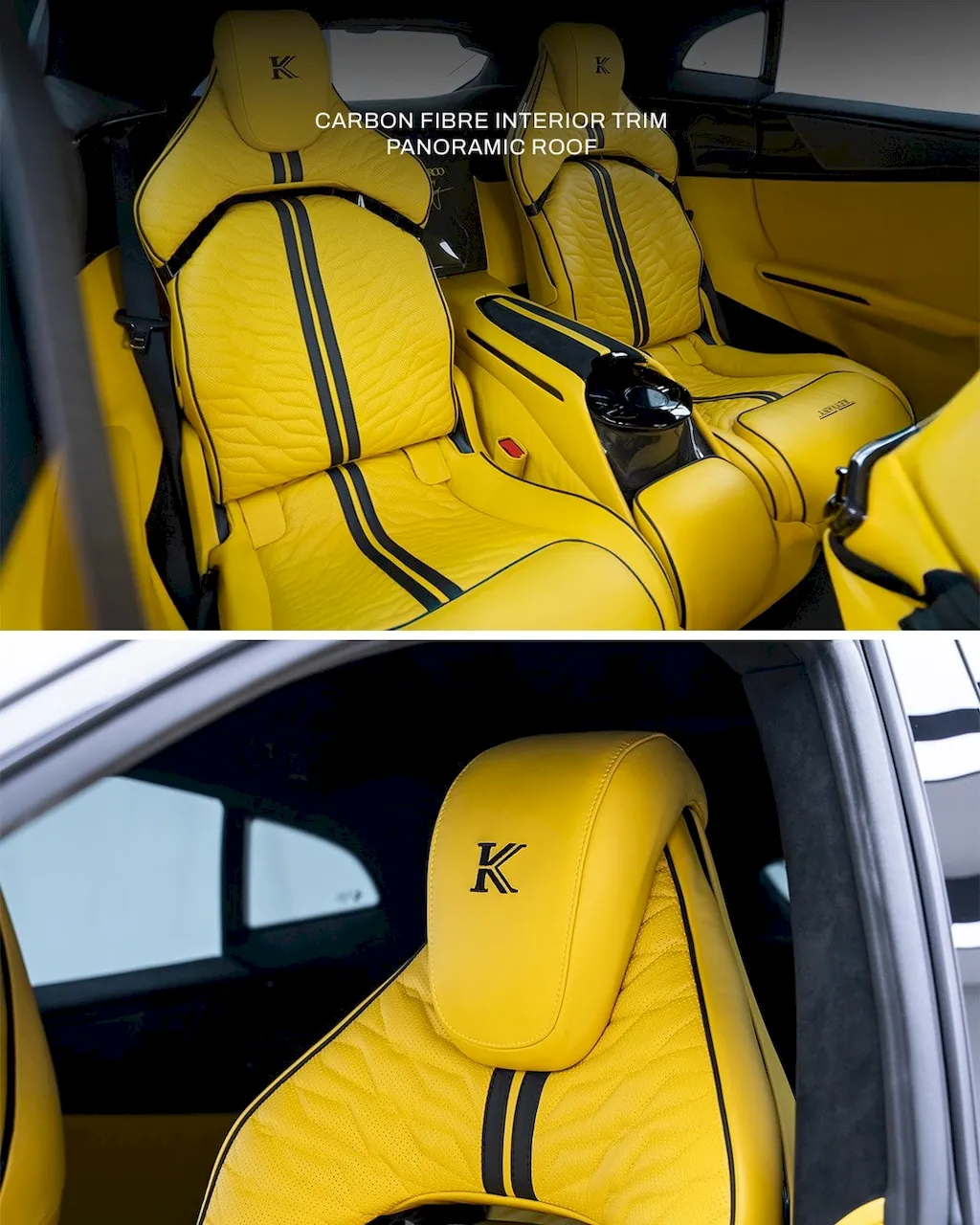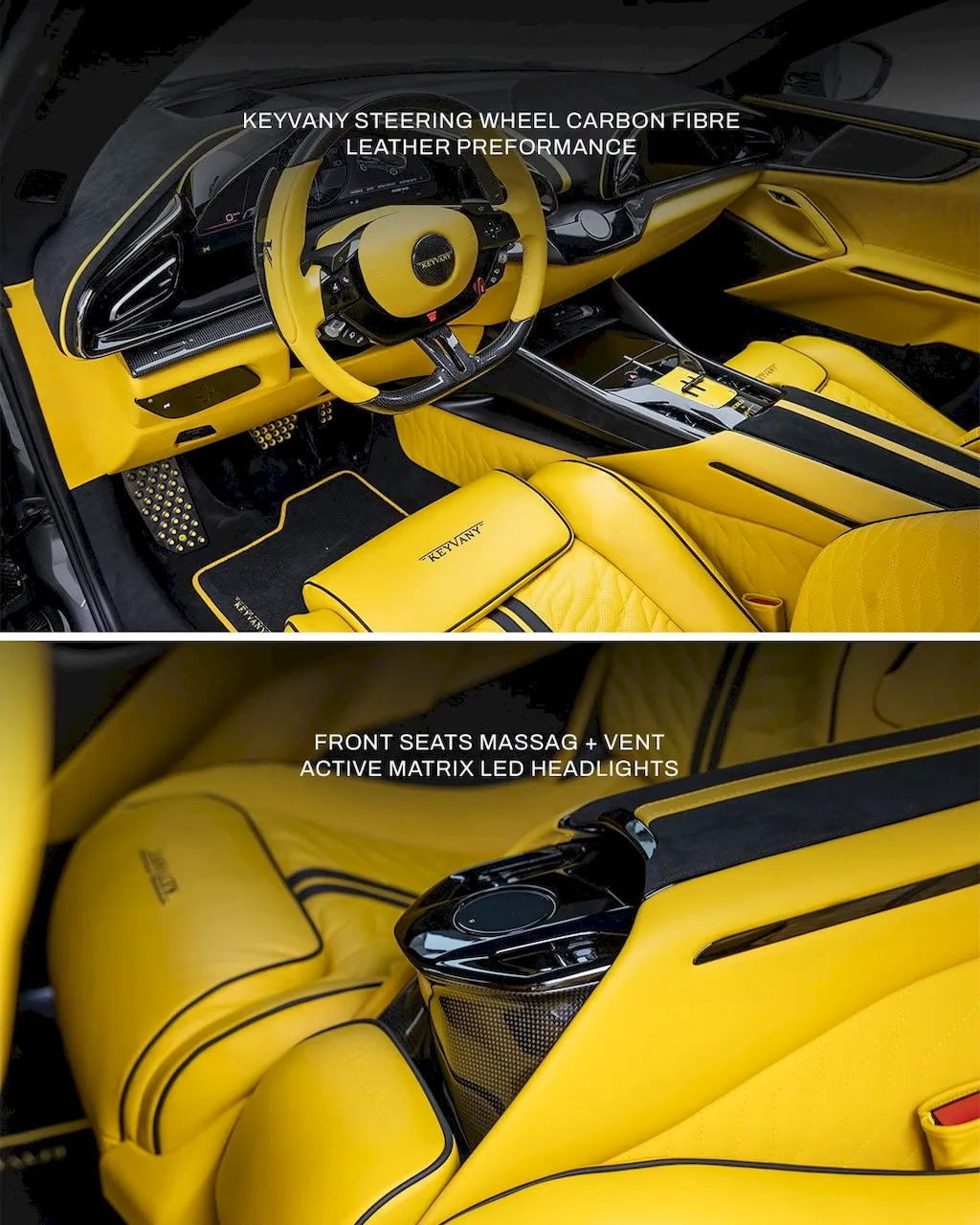 Inside, the story changes. Instead of continuing the dark theme, Keyvany went bold with bright yellow upholstery. The color covers the seats, lower dashboard, door panels, steering wheel, and center console, with black accents and carbon fiber trim providing contrast. Branded details are scattered throughout the cabin, along with premium features such as carbon fiber door sills, a panoramic roof, massaging front seats, and matrix LED headlights.