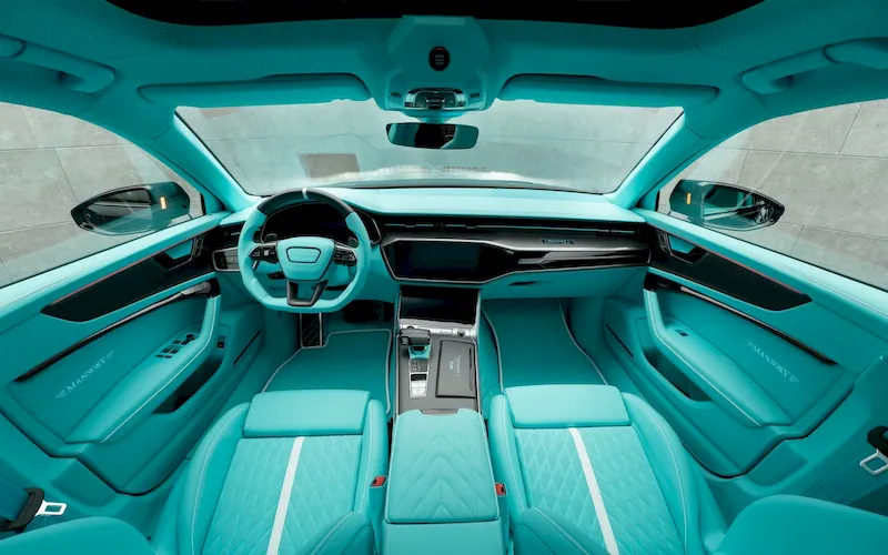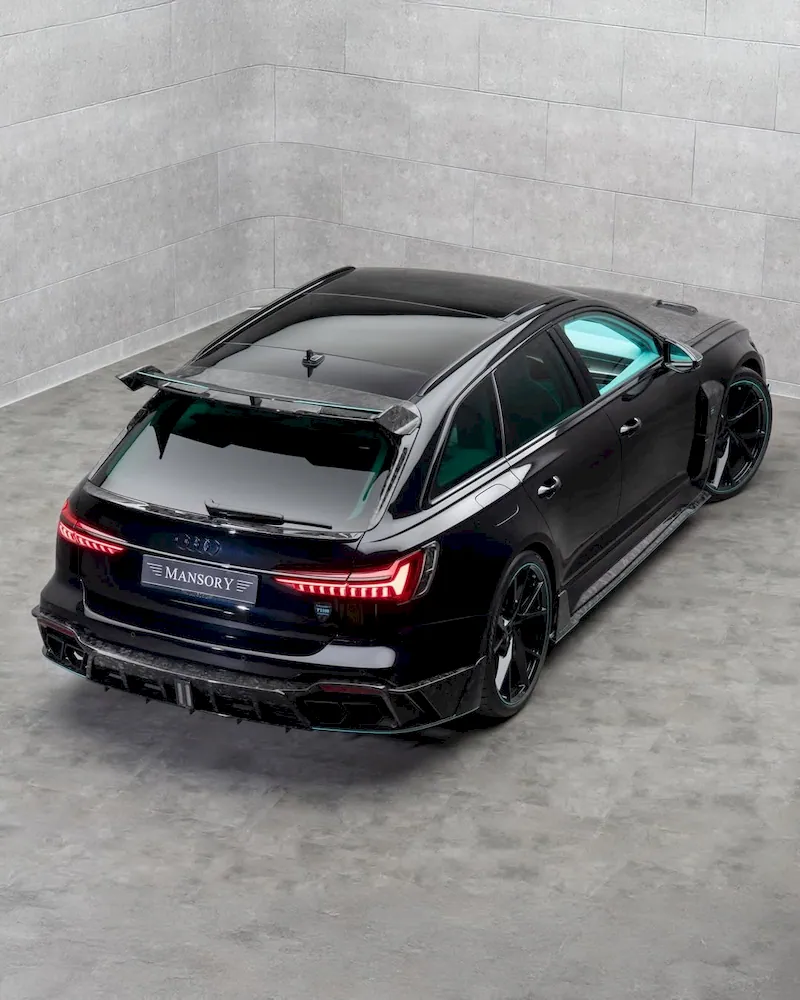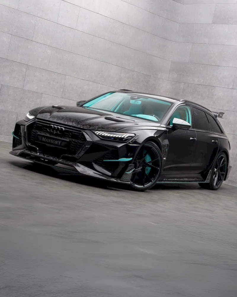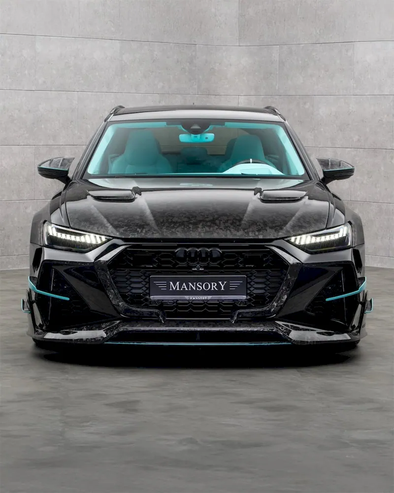 The exterior leaves no doubt that this is no ordinary Audi wagon. The car features an aggressive new front bumper, sculpted side skirts, a redesigned hood with functional vents, and a prominent rear spoiler. To underline its performance-focused image, Mansory fitted large wheels finished in carbon fiber, complemented by distinctive turquoise accents that add a striking contrast.