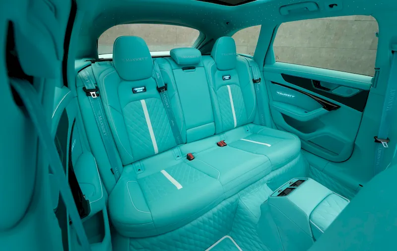 Inside, the transformation is just as dramatic. The cabin adopts a bold “mint” color scheme, mixed with white and red highlights. Illuminated Mansory logos appear on the seats and dashboard, while carbon fiber trim and a starlight headliner elevate the sense of luxury, especially at night.