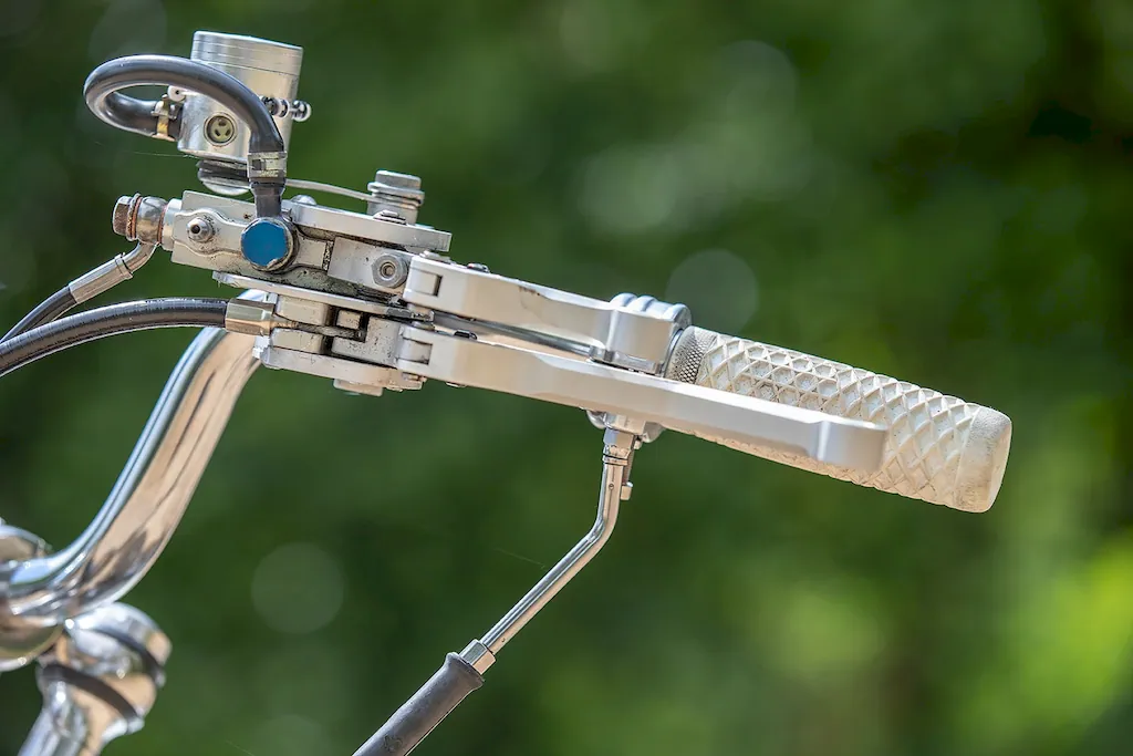 A tall and wide handlebar takes up the real estate up there, sporting a single rear-view mirror on the right. And because this was going to be Graeme Billington’s personal ride, he made the controls suitable for his condition by using a Kliktronic K-Lever2 clutch and brake system. The setup integrates both levers on the left-hand side, where you will also find the throttle.