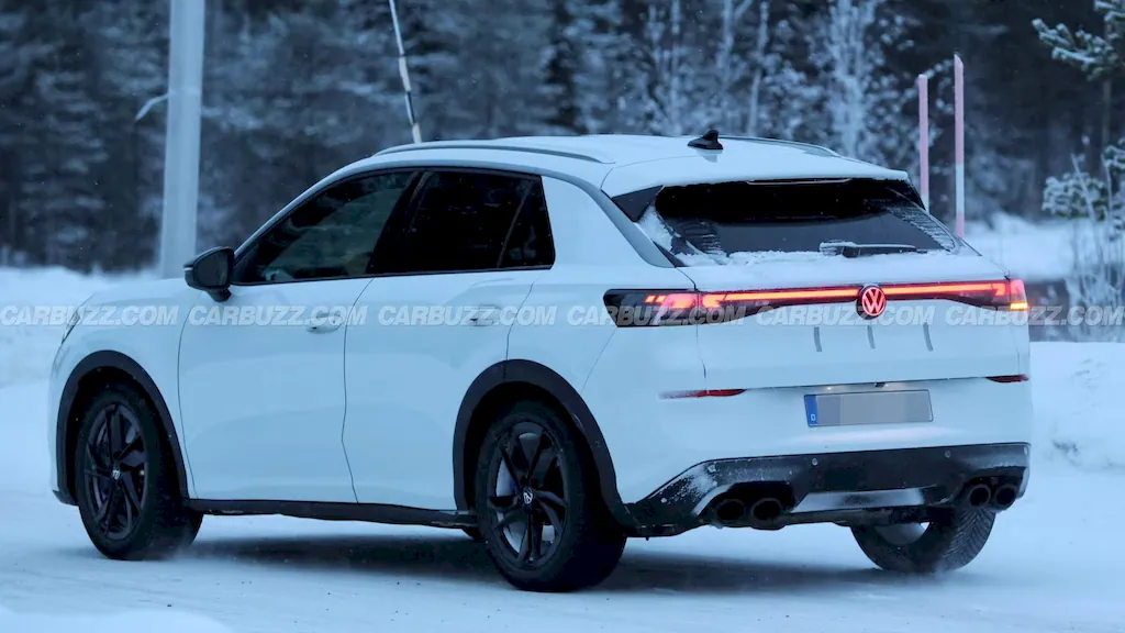 From the side, it appears the front overhang has grown slightly. Thanks to the redesigned bumper, the T-Roc R is likely a bit longer than before. The test vehicle also features signature Volkswagen R blue brake calipers and 19-inch alloy wheels. The rear end is even more revealing: a quad-exhaust setup and what looks like an optional Akrapovič performance exhaust. Photographers noted a deep, throaty exhaust note—and a driver who seemed to be thoroughly enjoying the experience.