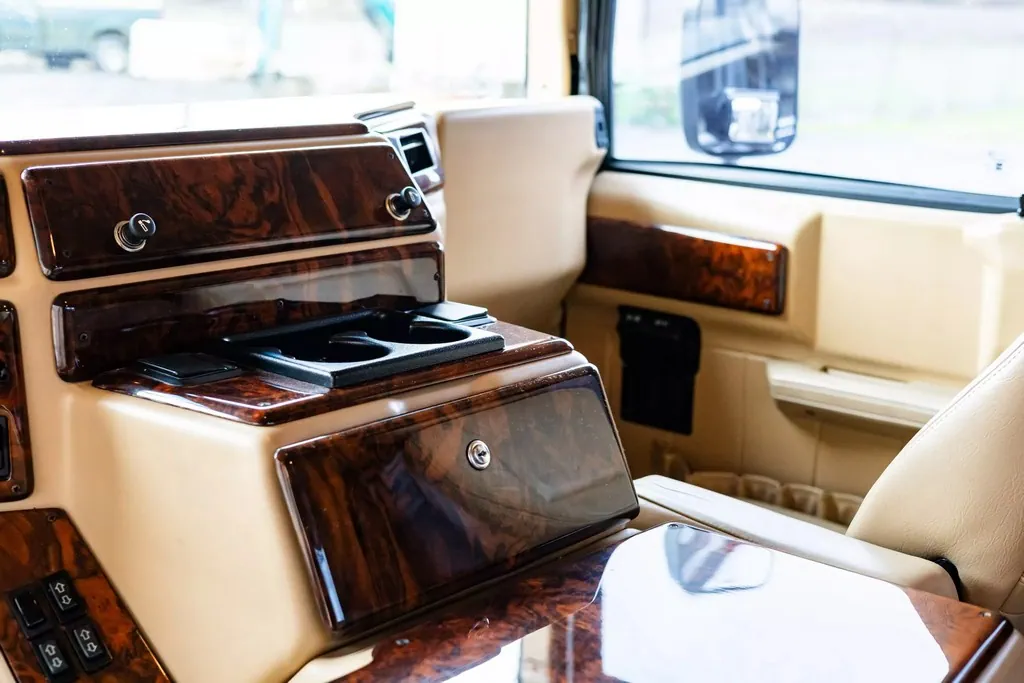 From the outside, the Hummer looks purpose-built and almost spartan, with roof-mounted spotlights and a winch integrated into the front bumper. Step inside, however, and the story changes completely. The cabin is trimmed in cream-colored leather and glossy wood, evoking the feel of a luxury sedan—closer to a Jaguar XJ than a military truck. That contrast between rugged hardware and upscale comfort was very much a signature of the period.