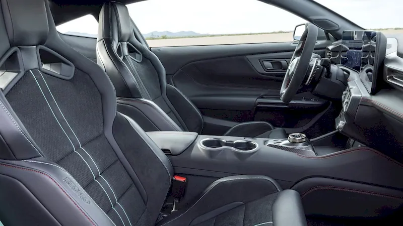 The car is also equipped with Brembo carbon-ceramic brakes, forged suspension control arms, a magnesium strut brace, and updated MagneRide dampers. However, unlike the Mustang GTD—which features a bespoke chassis developed with Canadian engineering firm Multimatic, extensive body and layout modifications, and a rear-mounted transaxle gearbox—the Dark Horse SC retains a conventional layout.