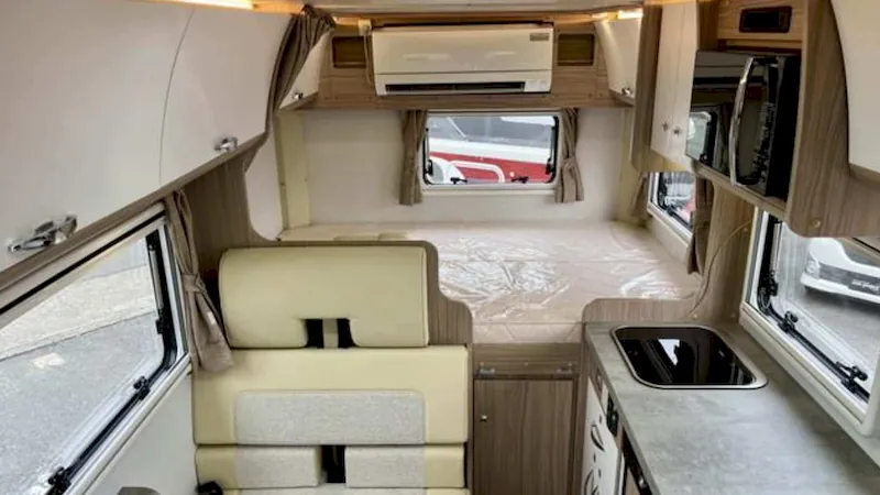 Inside, the camper features a cleverly designed and well-organized interior. It lacks a separate bathroom with a toilet and an electric cooktop, but makes up for it with a functional kitchenette that includes a refrigerator, sink, and microwave. There are also five sleeping spaces and air conditioning.
