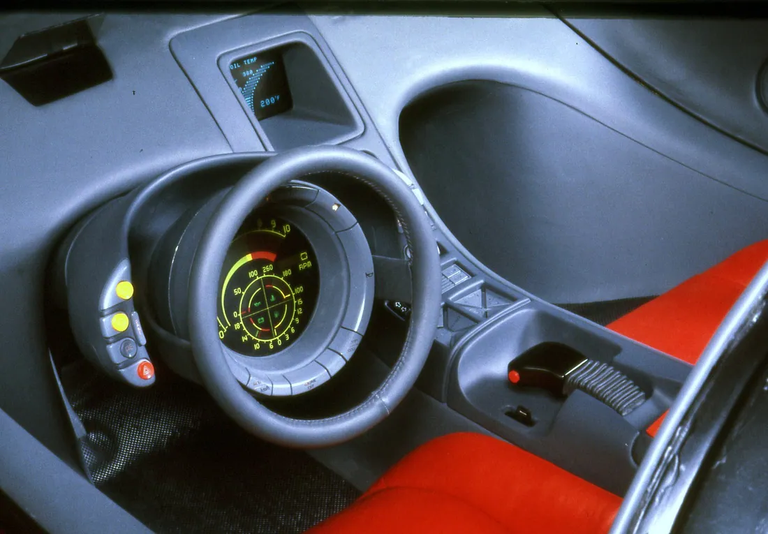 At the center of the dashboard sat a three-dimensional “ignition map” showing various engine operating parameters. Additional displays provided readouts for G-forces during cornering, acceleration, and braking; power output; torque; ignition timing for engine tuning; tire slip percentage; low tire-pressure warnings; vehicle direction via an electronic compass; and even oil temperature—all well ahead of their time.