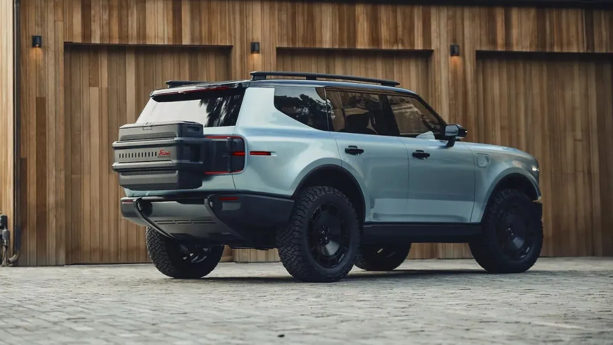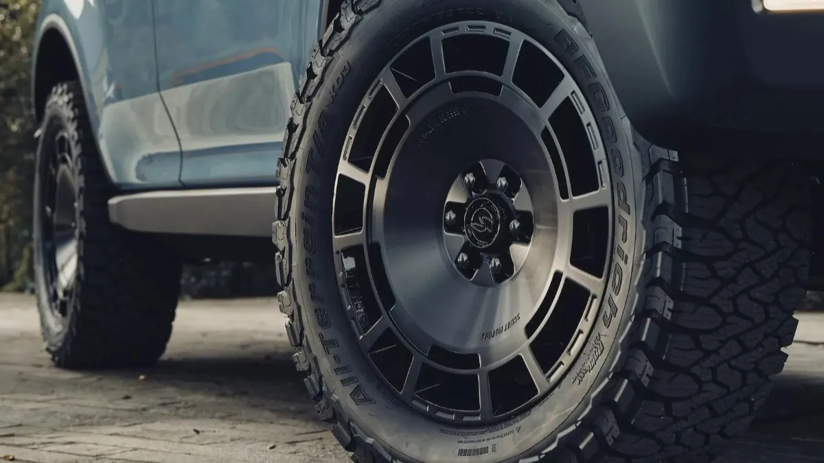 The concept rides on black 22-inch wheels wrapped in 35-inch BFGoodrich T/A KO3 off-road tires. The roof and door handles are also finished in black. The vehicle is fitted with roof cargo rails and replaces the traditional full-size spare tire with a stylish rear-mounted storage pack featuring two compartments. Scout hasn’t ruled out putting this accessory into production.