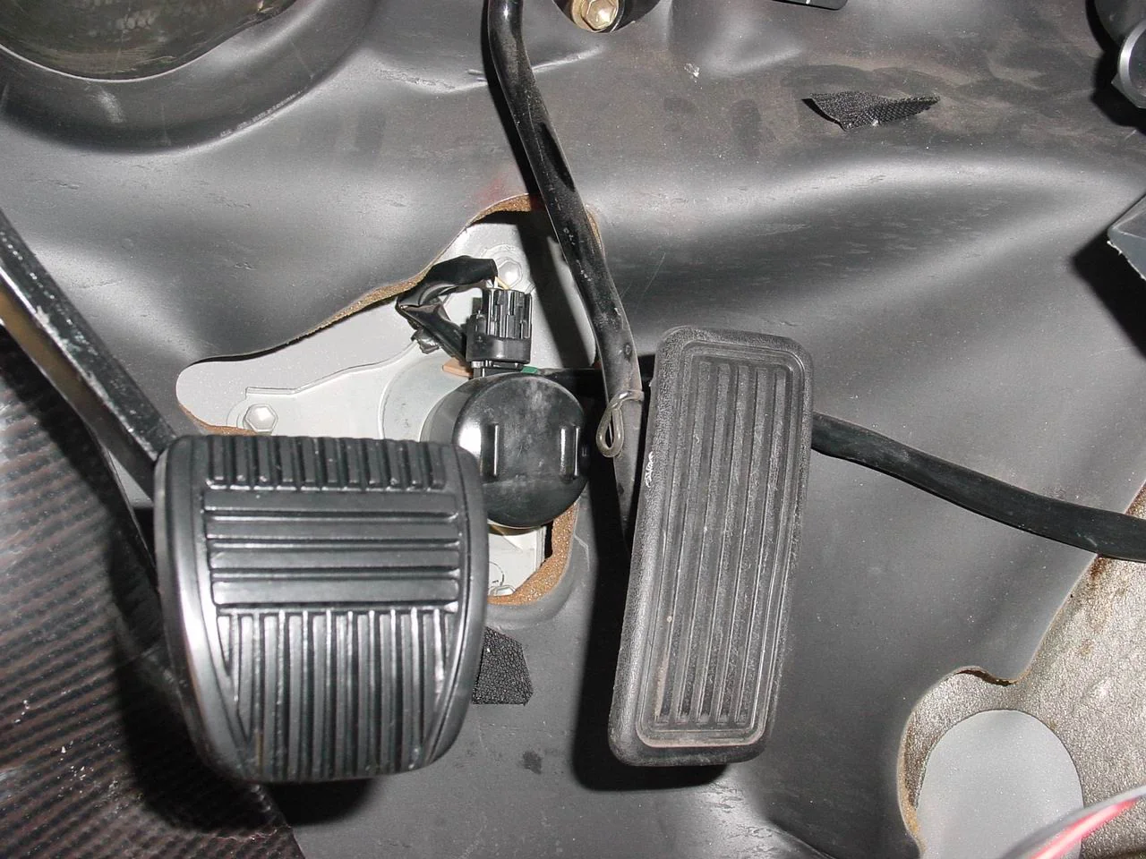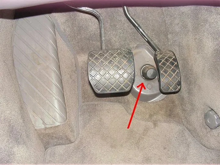 The purpose of the button is less obvious in cars with a manual transmission. In some cases, its presence is simply the result of parts standardization. Automakers may use the same floor trim for all versions of a model. With an automatic transmission, the mechanism functions as a kickdown switch, while in manual-transmission versions it may be replaced by a dummy plug. In a similar way, a button-like component can also serve as a pedal stop, limiting the travel of the accelerator.