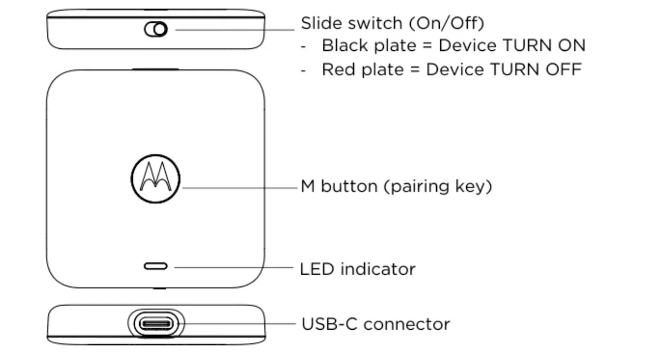 The lone button sits on the front, integrated into the Motorola logo, and is used for pairing.