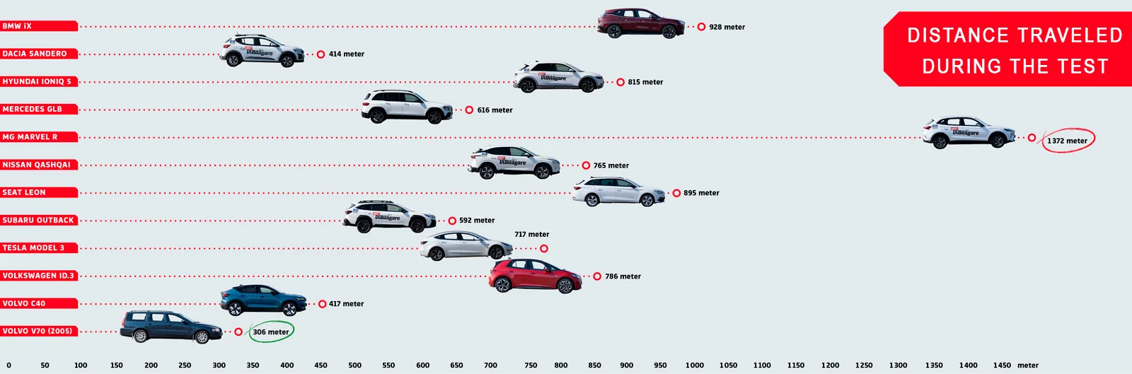The worst performer was the MG Marvel R. It traveled more than a full kilometer farther than the Volvo before the driver finished all the tasks. Completing the test took 44.9 seconds, during which the vehicle covered 1,372 meters (about 0.85 miles).