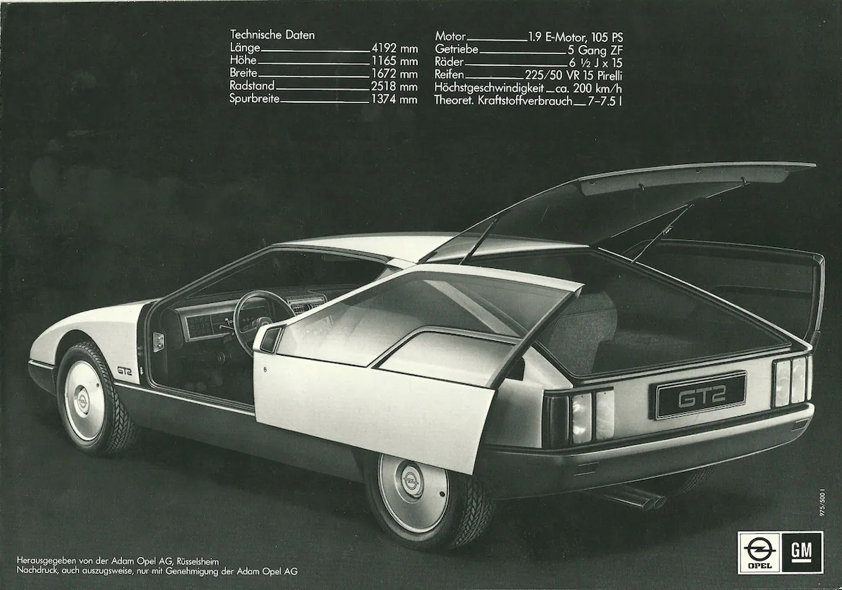 All'IAA del 1975, una delle auto che attirò molta attenzione fu l'Opel GT2 ad alta aerodinamicità. Come suggerisce il nome, si trattava di un esercizio stilistico destinato a essere un potenziale successore del leggendario Opel GT, costruito dal 1968 al 1973 e che conquistò fan con i suoi elementi di design "baby Corvette".